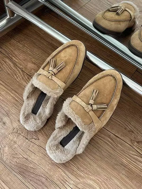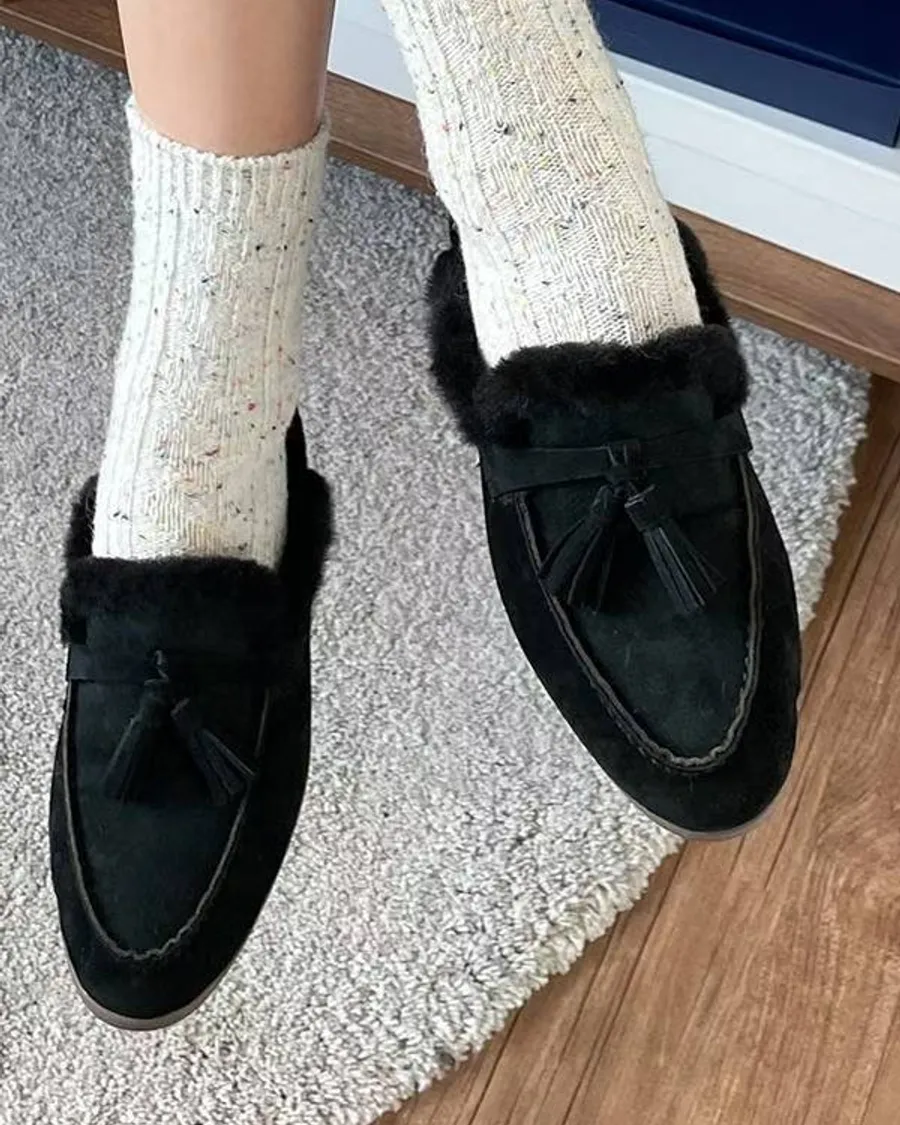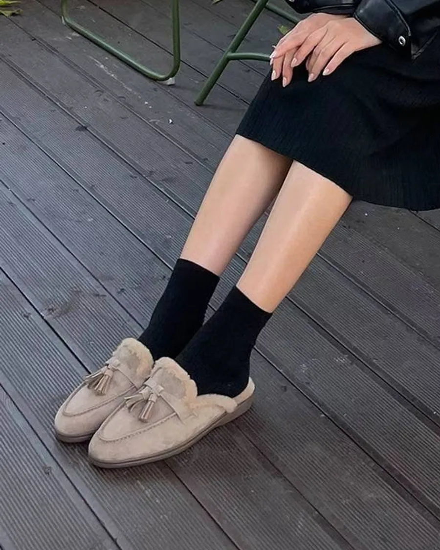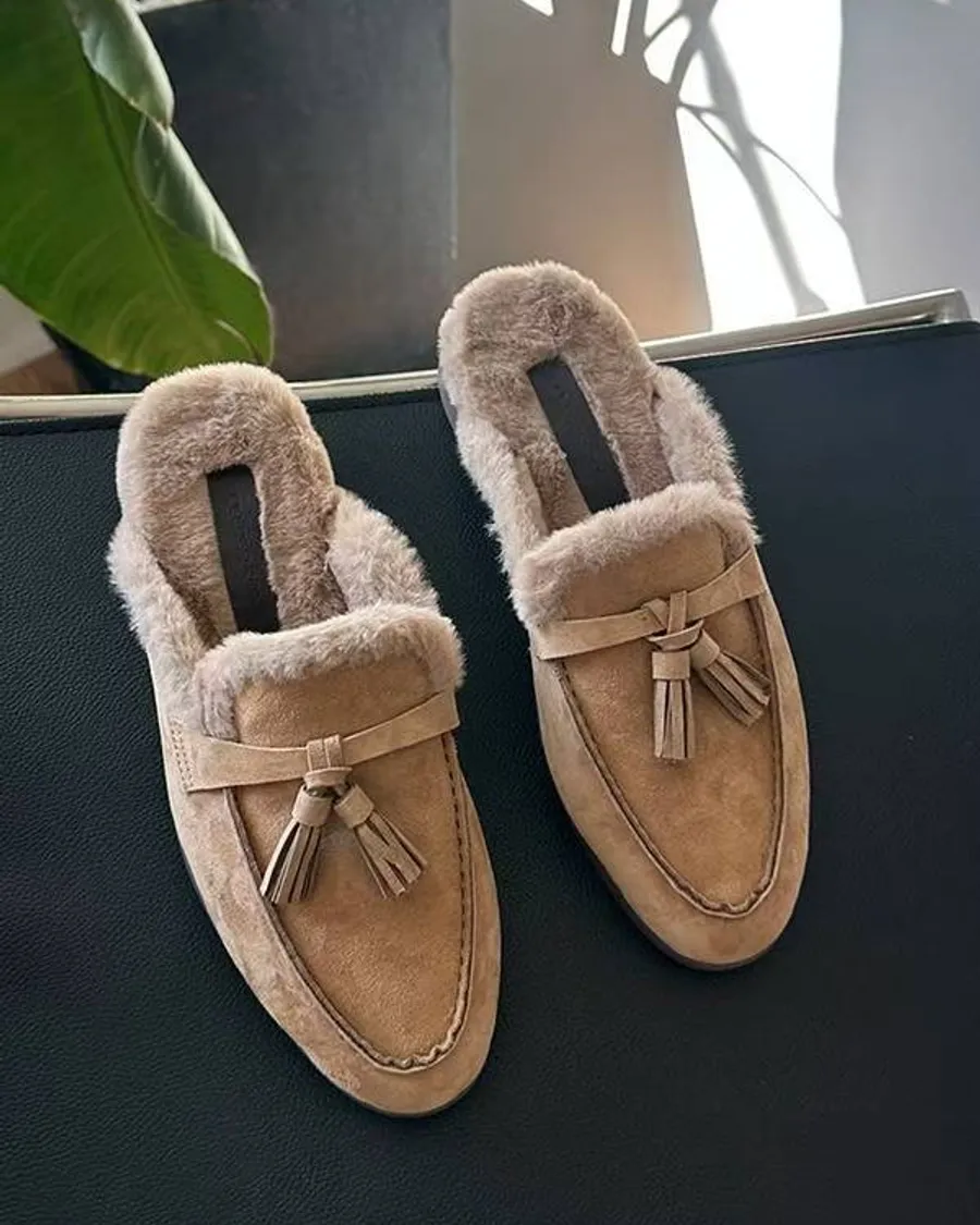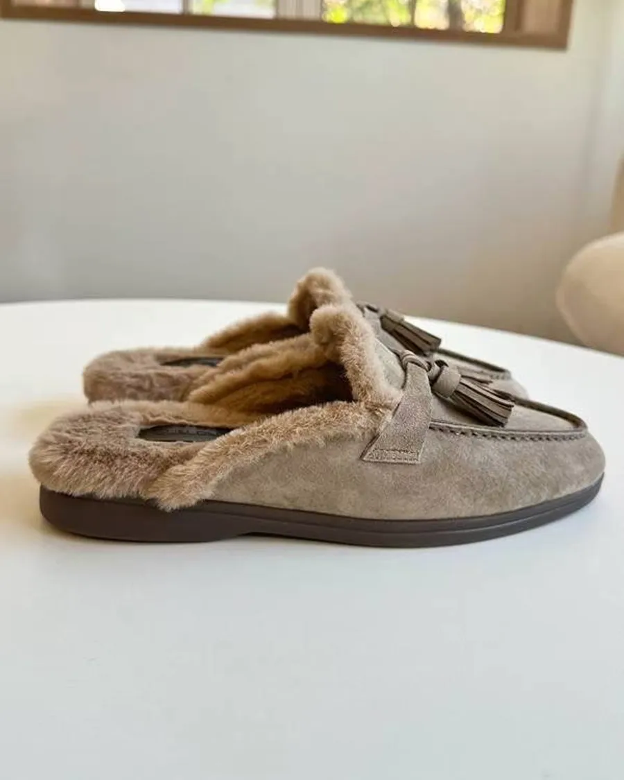 麂皮的色調很溫柔,配上流蘇細節,整體風格偏輕鬆,適合冬天想穿得舒服一點的日常搭配。