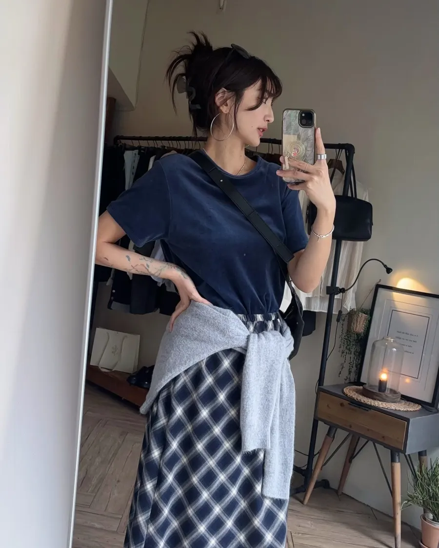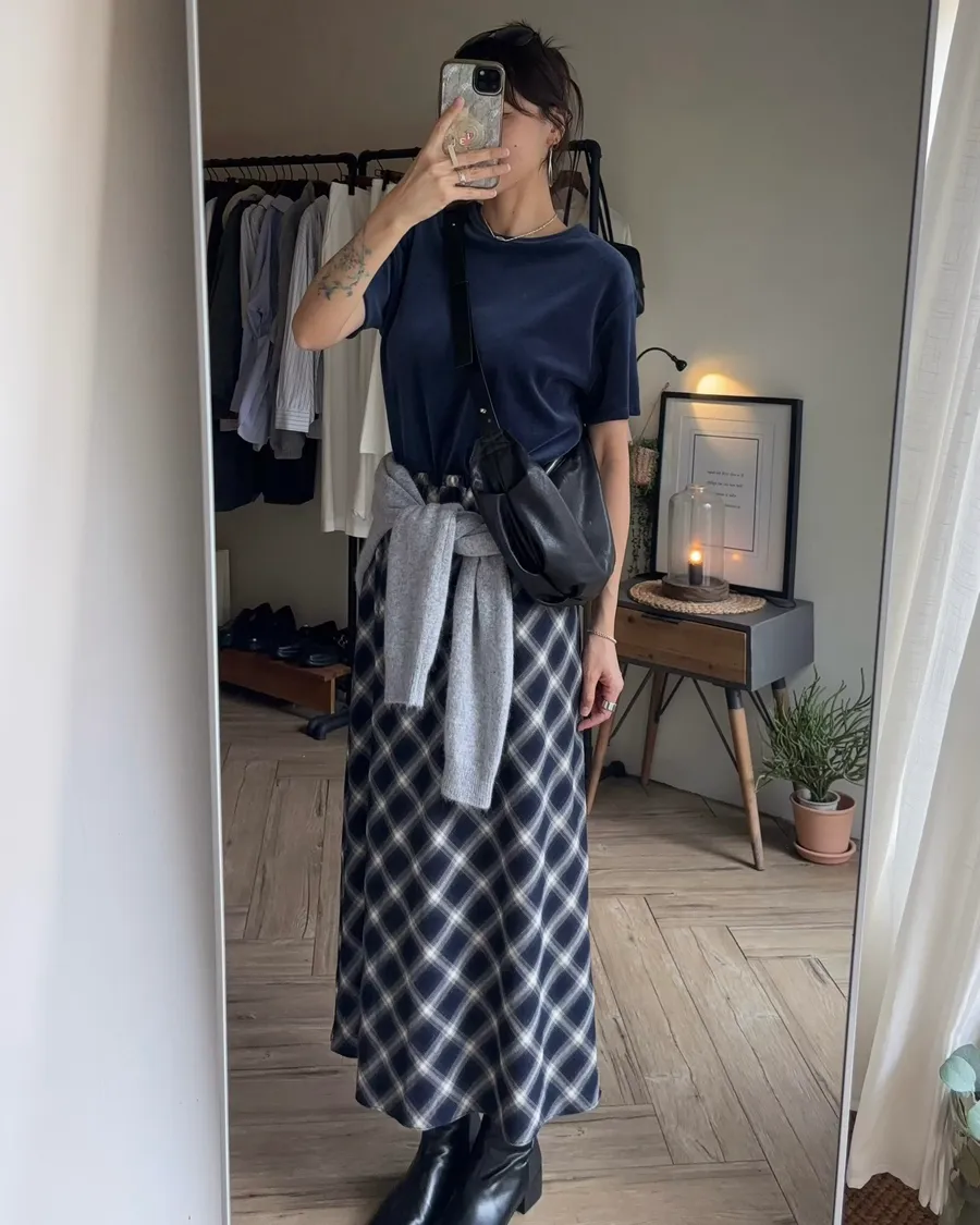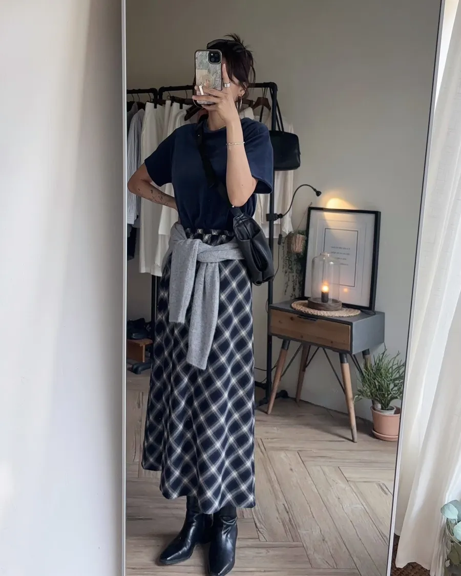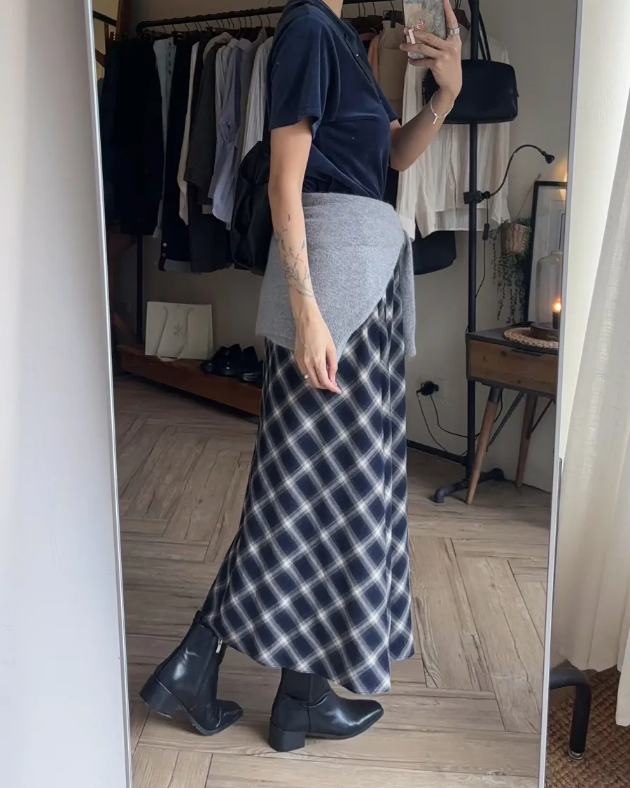 把格紋從襯衫延伸到裙裝如果平常喜歡穿比較素面的上衣其實搭這種格紋就會很加分 不是貼身版型帶點休閒感所以配球鞋、短靴都很好看格紋的排列也比較簡約不複雜有點水光波紋感