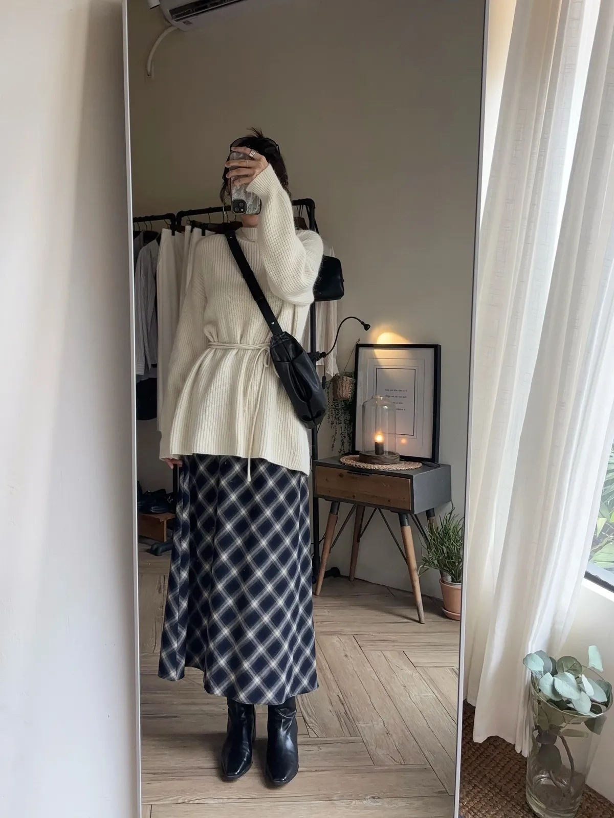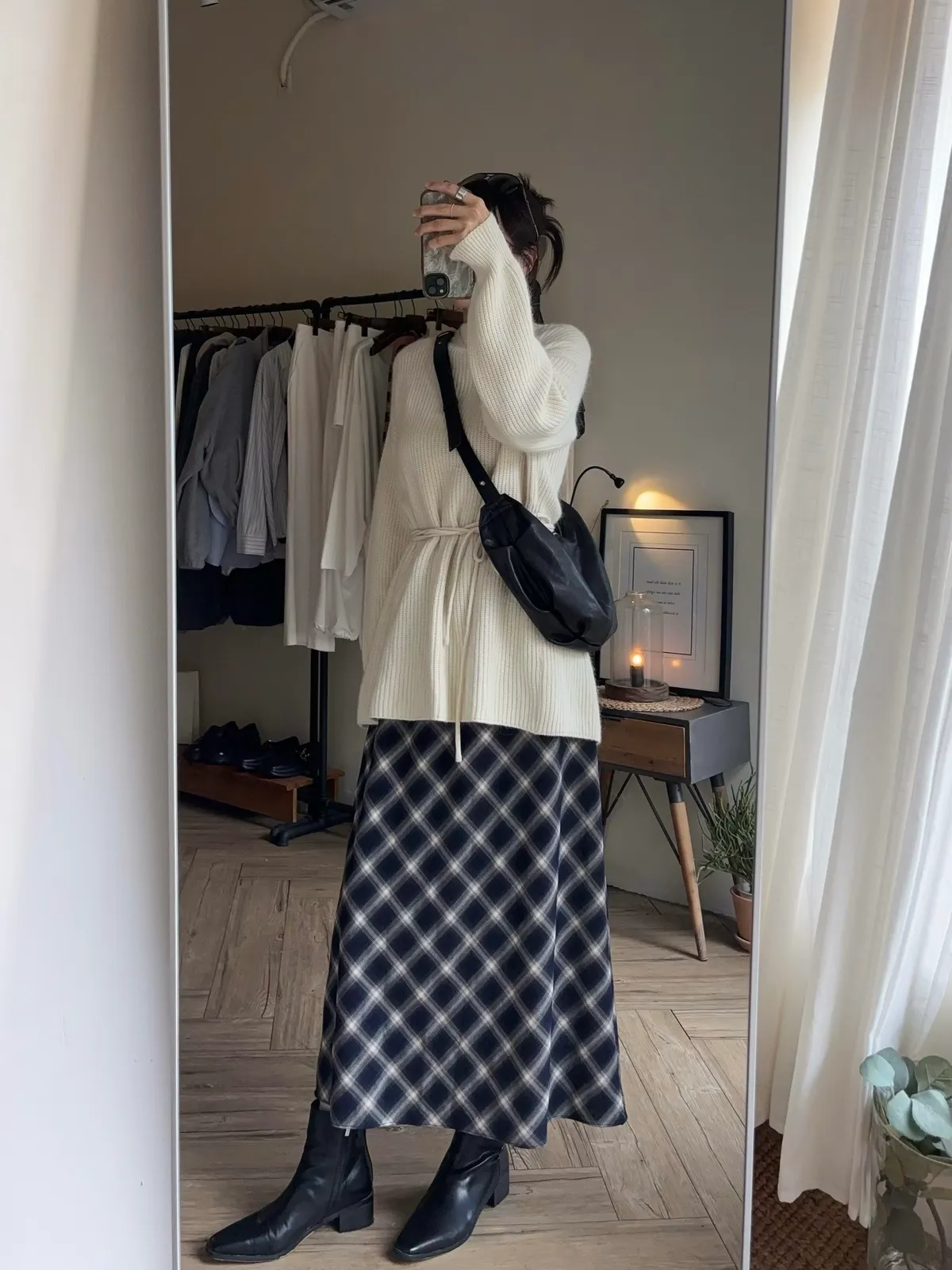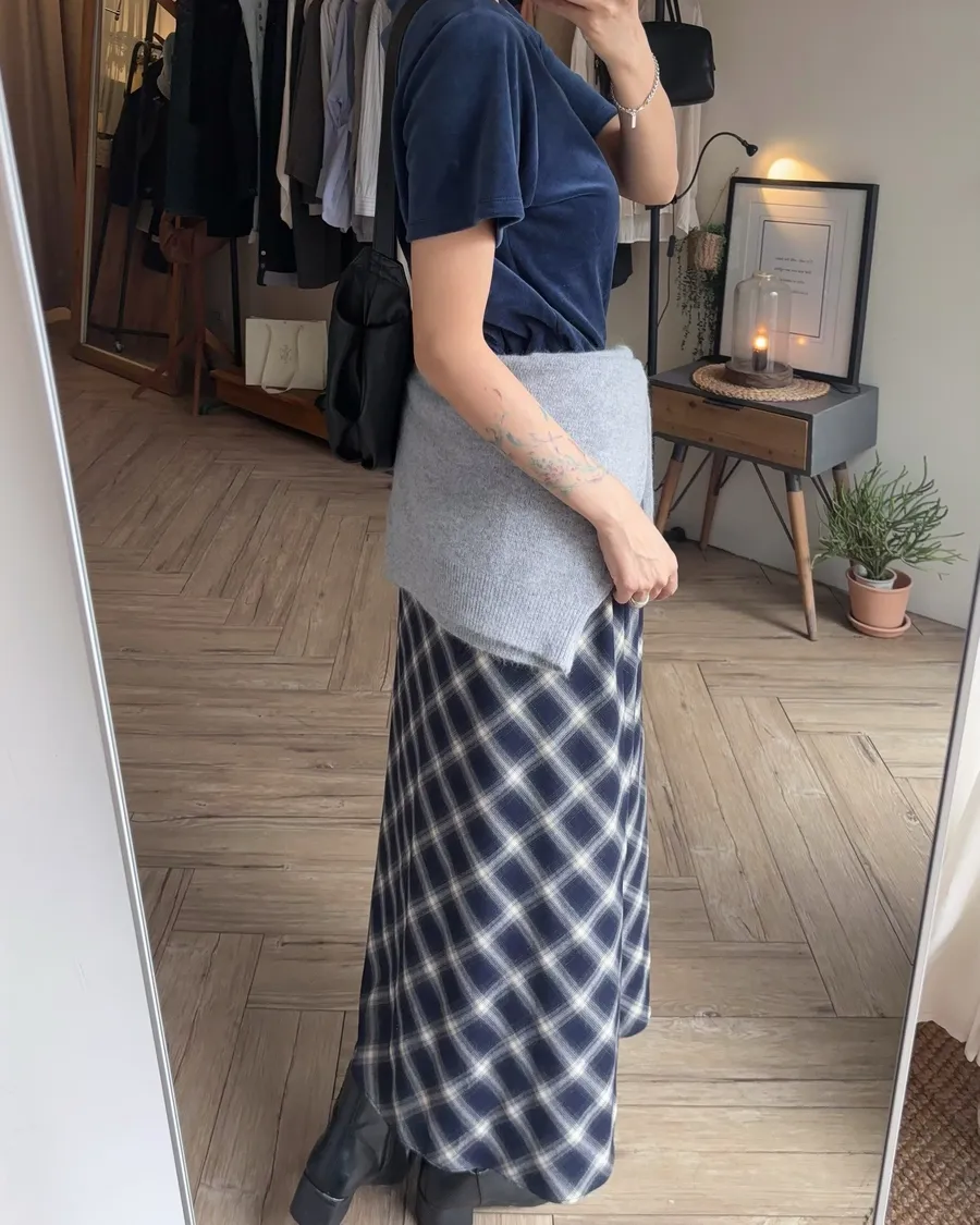 把格紋從襯衫延伸到裙裝如果平常喜歡穿比較素面的上衣其實搭這種格紋就會很加分 不是貼身版型帶點休閒感所以配球鞋、短靴都很好看格紋的排列也比較簡約不複雜有點水光波紋感